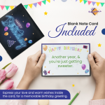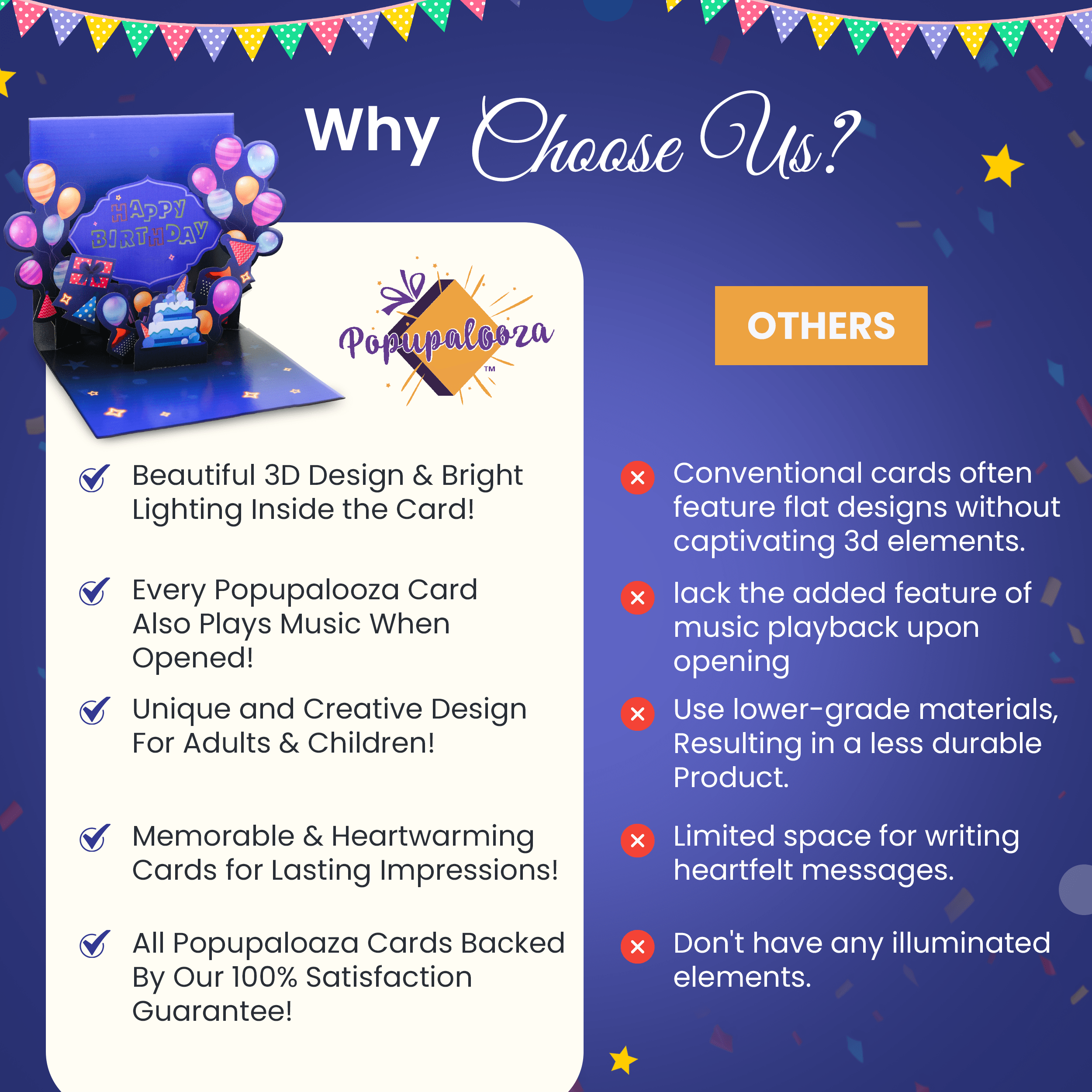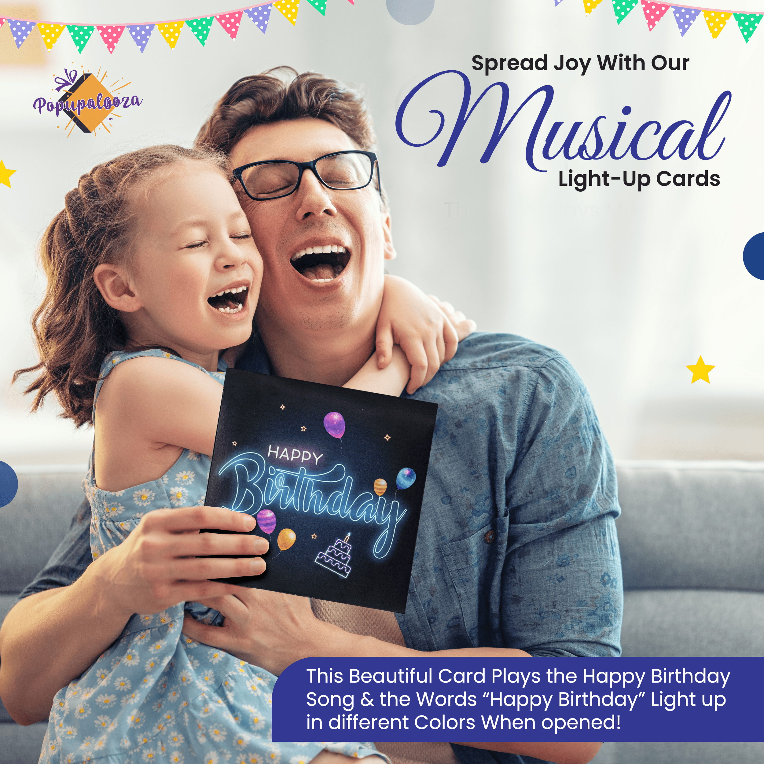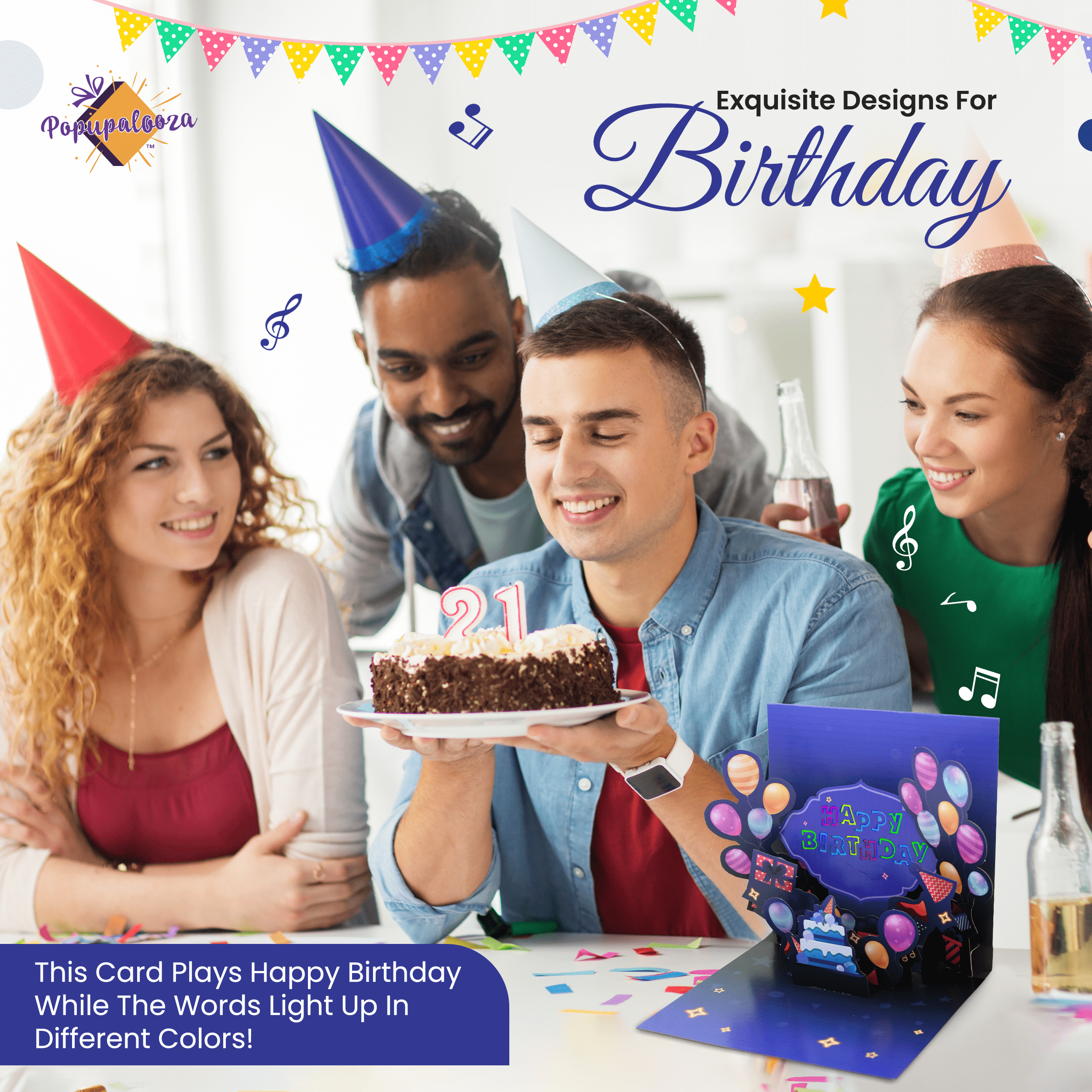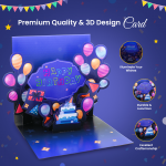 When the card is opened, balloons, cakes, and gifts pop up, creating a festive scene that sets the stage for the perfect birthday surprise. Accompanied by the cheerful tunes of the “Happy Birthday” song, the card illuminates with the words “Happy Birthday,” adding an extra touch of magic to the occasion.