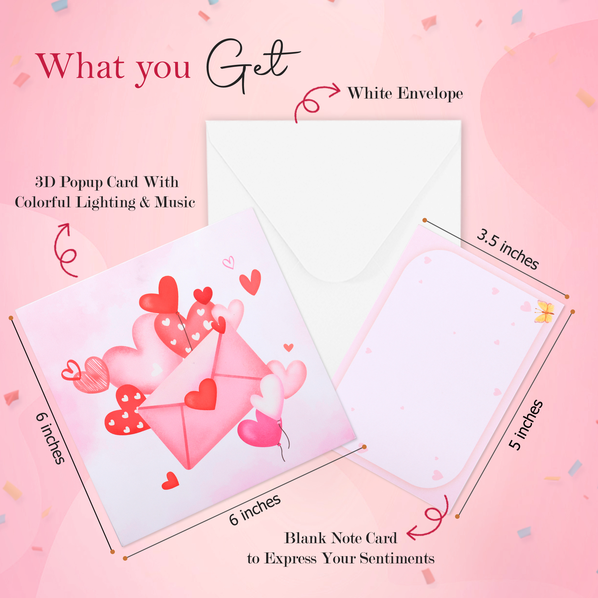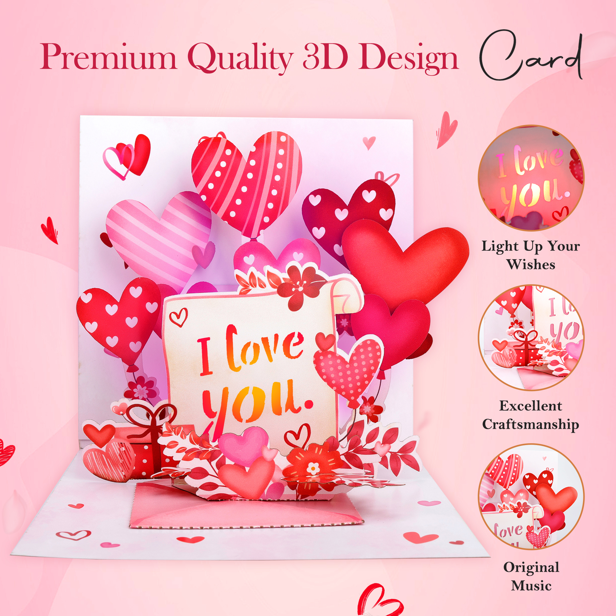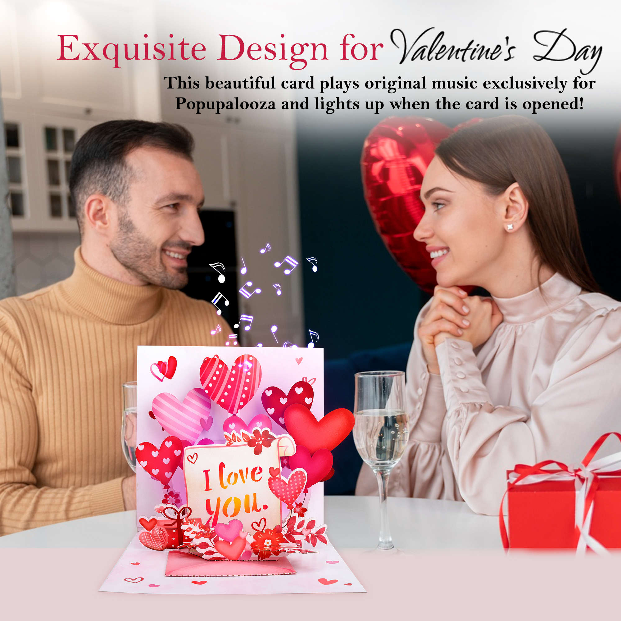 - Celebrate with Love – Open this breathtaking card to hear an original romantic song exclusive to Popupalooza. The 3D art of hearts and flowers, along with the illuminated “I Love You’ wording, creates an unforgettable celebration.