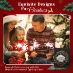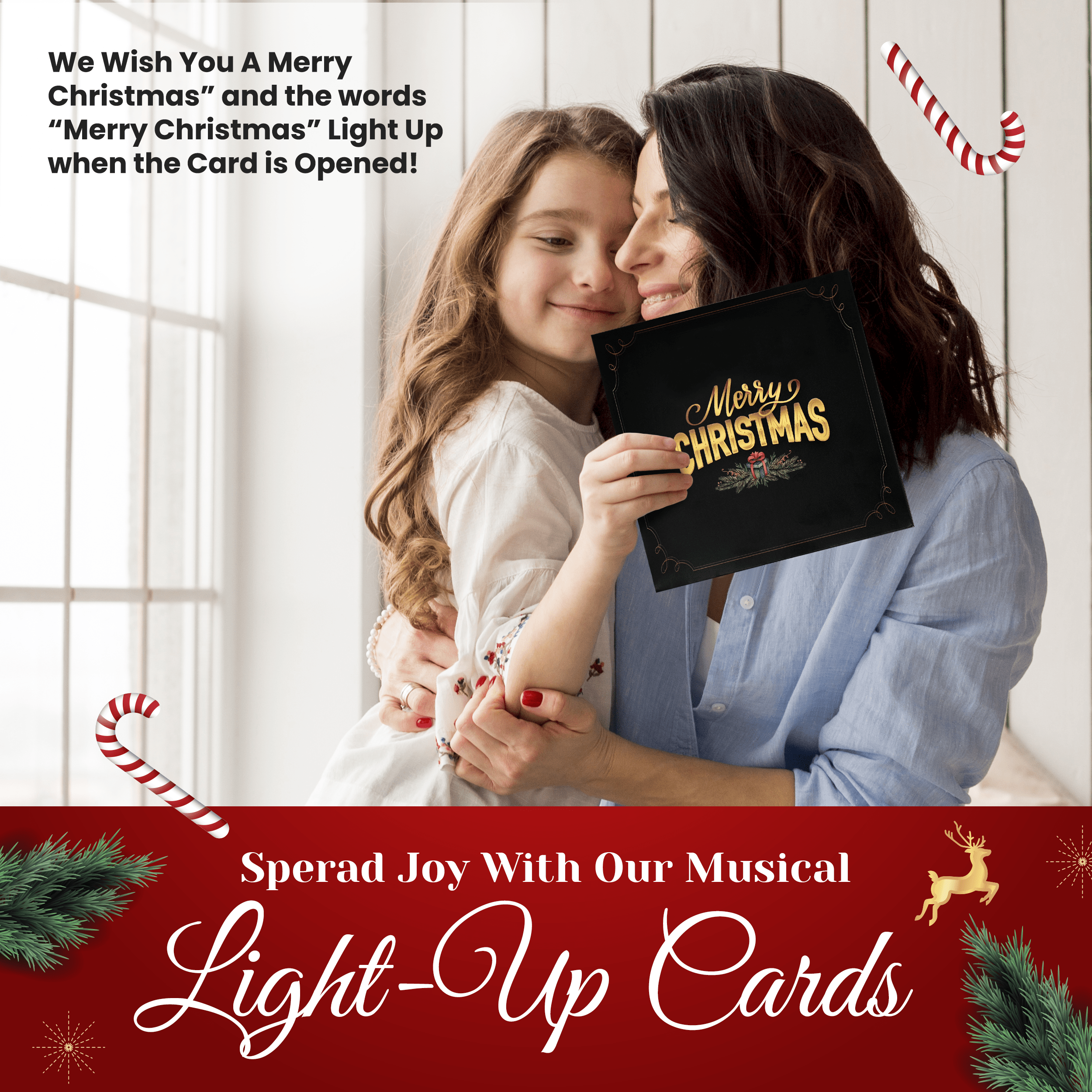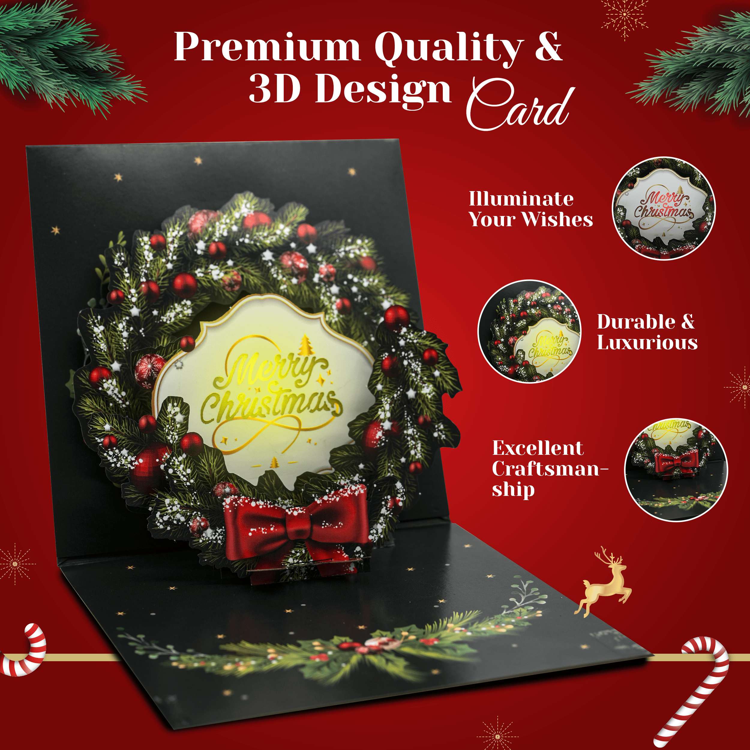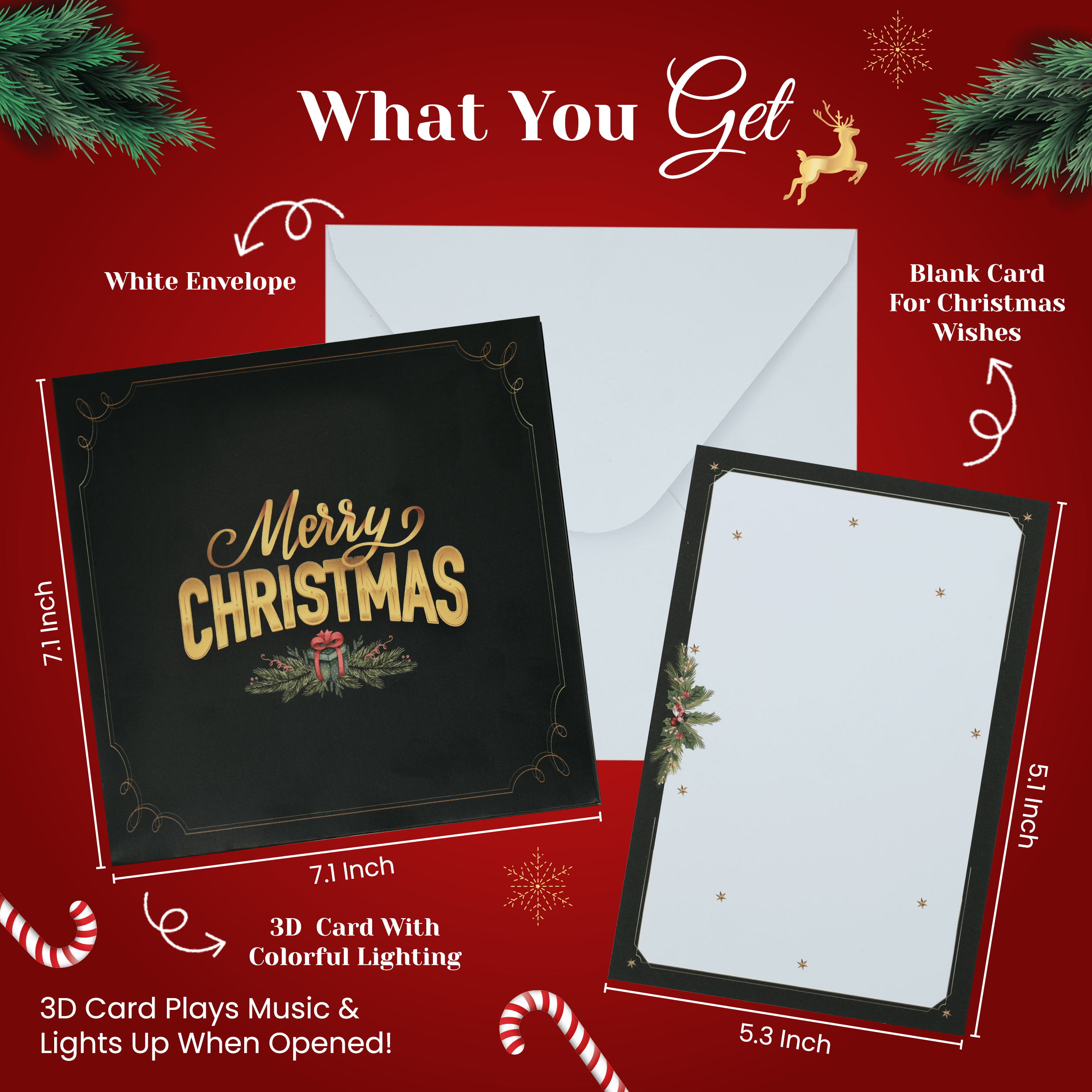 Experience the wonder as a beautiful wreath pops up when you open the card, bringing in the spirit of the season. The familiar melody of “We Wish You a Merry Christmas” fills the air, while the words “Merry Christmas” light up in different hues, illuminating the joy of the holiday season.